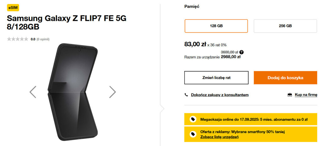 Co prawda rzeczywiście Samsung Galaxy Z Flip7 FE 128 GB ma obniżoną z 3600 do 2988 złotych cenę (36 rat po 83 zł, rabat -612 zł) w Planie L. Z kolei wariant 128 GB w tym samym pakiecie kosztuje teraz 3960 zł (36x 110 zł; rabat -288 zł). Rabaty są jednak przyznawane także w ofercie bez umowy na abonament komórkowy.
