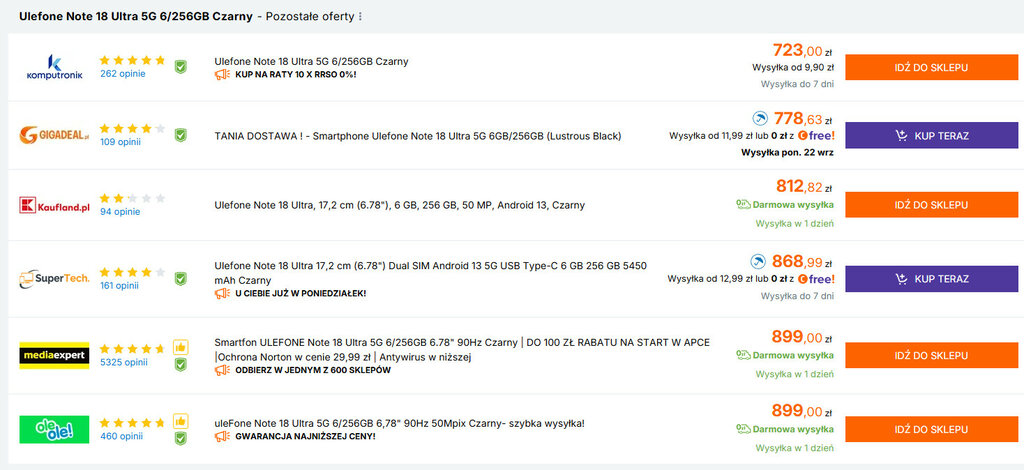 Za model Ulefone Note 18 Ultra zapłacisz około 750-900 złotych w zależności od sklepu. Do wyboru jest jeszcze czarny i biały wariant obudowy z podobnym efektem wizualnym.