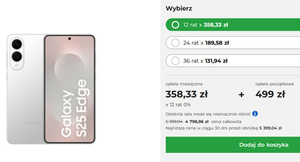 Pierwotna cena Galaxy S25 Edge 12/256 GB w Plusie wynosi min. 5399,04 zł. Tyle kosztował ten smartfon w zakupie na 12 rat. Teraz cena spada do 4798,96 zł i składa się z 12 rat po 358,33 zł i jednorazowej opłaty początkowej (startowej) w wysokości 499 złotych.