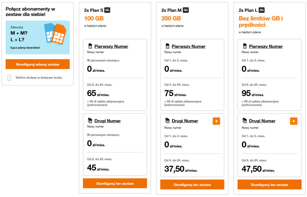 O ile nju z 3 numerami przegrywa z powyższym Plushem o włos (a dokładniej o zaledwie jedną złotówkę), o tyle w konfiguracji z 4 i 5 kartami SIM jest już tańszy. Także w nju umowa jest bezterminowa, ale jeśli potrzebujesz nowe urządzenie, to pozostaje zakup telefonu w sklepie lub na orange.pl.