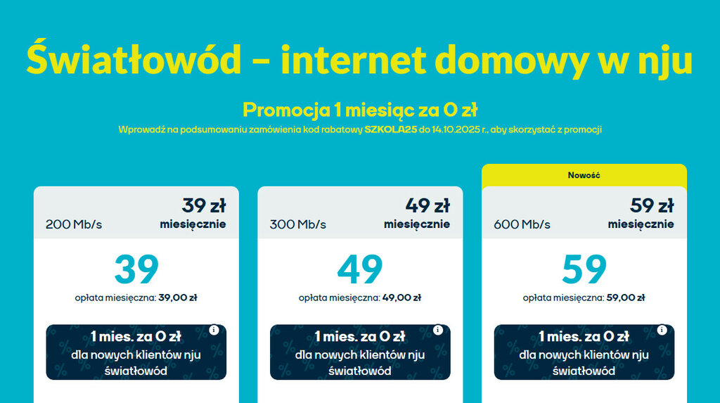 W ten sposób zaoszczędzisz 39, 49 lub nawet 59 złotych, bo tyle kosztuje miesięcznie światłowód nju.