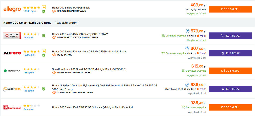Jeżeli nie boisz się zakupu telefonu komórkowego na platformie Allegro, to właśnie tu Honor 200 Smart 4/256 GB oferowany jest w zdecydowanie najniższej cenie, przynajmniej według porównywarki Ceneo.pl. Smartfon kosztuje 489 złotych, ale nie brak droższych ofert za ponad 600 czy nawet 900 zł. Rozrzut cenowy jest więc naprawdę spory.