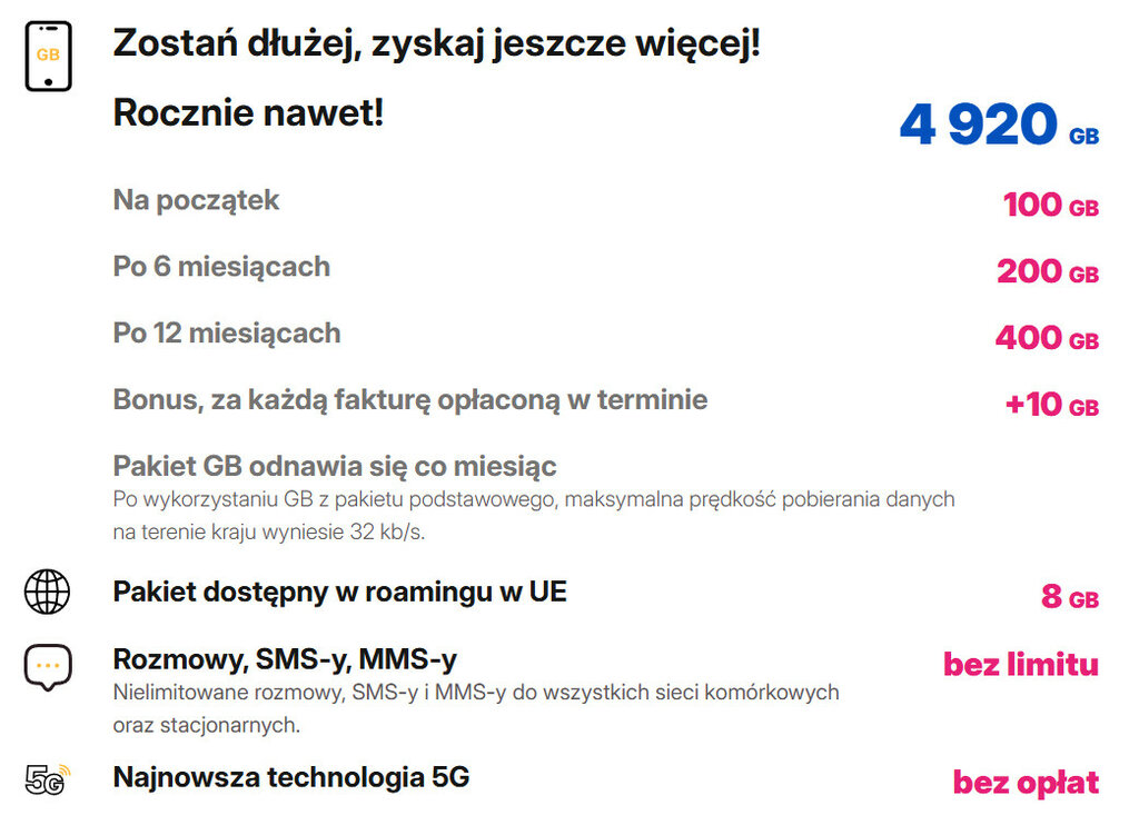 Nieliczni operatorzy, jak właśnie Plush czy nju mobile, oferują bonus GB za staż w sieci. Zasada jest prosta jak budowa cepa: im dłużej jesteś u danego operatora komórkowego, tym należy Ci się większy transfer danych. W ten sposób możesz w Plushu i nju dobić z bazowych kilkudziesięciu gigabajtów do nawet 300 GB 5G – i to bez zmiany ceny pakietu! Tyle na Ciebie czeka w abonamentach za 40 i 49 zł.