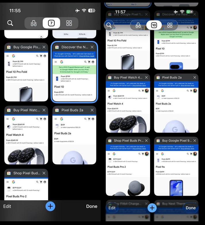Zmiany w Liquid Glass zaczynają się właśnie w siatce kart, gdzie po lewej stronie znajduje się tryb incognito (zawsze widoczny), przełącznik kart i grup kart oraz wyszukiwanie. Poniżej znajdują się również opcje edycji.