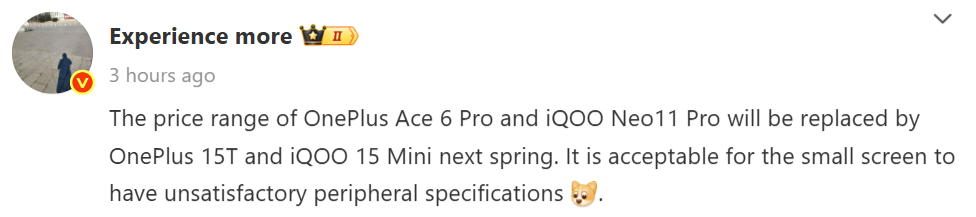 Do sieci trafiły informacje pochodzące od wiarygodnego informatora, jakim jest Digital Chat Station, które wskazują na anulowanie planów dotyczących telefonów OnePlus Ace 6 Pro oraz iQOO Neo 11 Pro. Te doniesienia zdaje się potwierdzać również inny tipster, Experience More. Opublikował on na portalu Weibo post sugerujący, że zamiast tych urządzeń firma wprowadzi na rynek OnePlus 15T oraz iQOO 15 Mini.