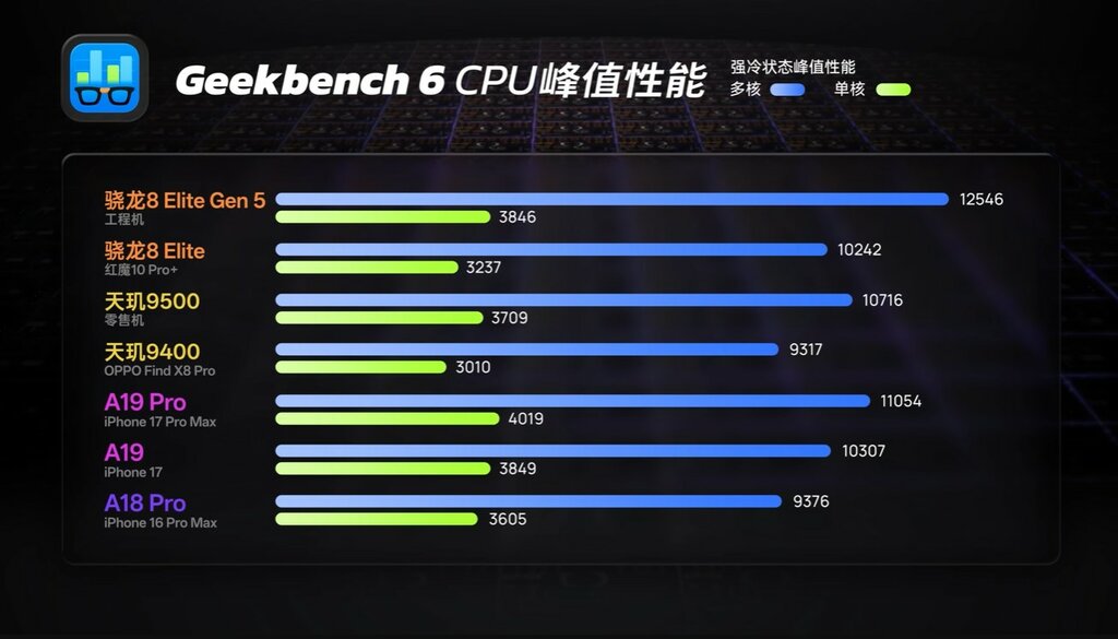Geekerwan przeprowadził dogłębną analizę techniczną wydajności jedno- i wielordzeniowej Snapdragona 8 Elite Gen 5. Geekbench 6 po raz kolejny pokazuje, że A19 Pro obecnie króluje w obciążeniach jednowątkowych.