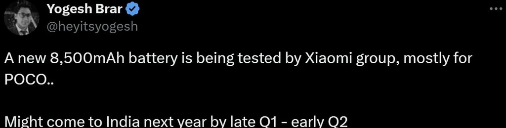 Yogesh Brar podzielił się nowościami z obozu Xiaomi, według których co najmniej jeden z nadchodzących modeli POCO będzie mieć baterię o pojemności 8500 mAh. Biorąc pod uwagę przewidywaną przez niego datę premiery, chodzi tu o POCO X8 Pro.