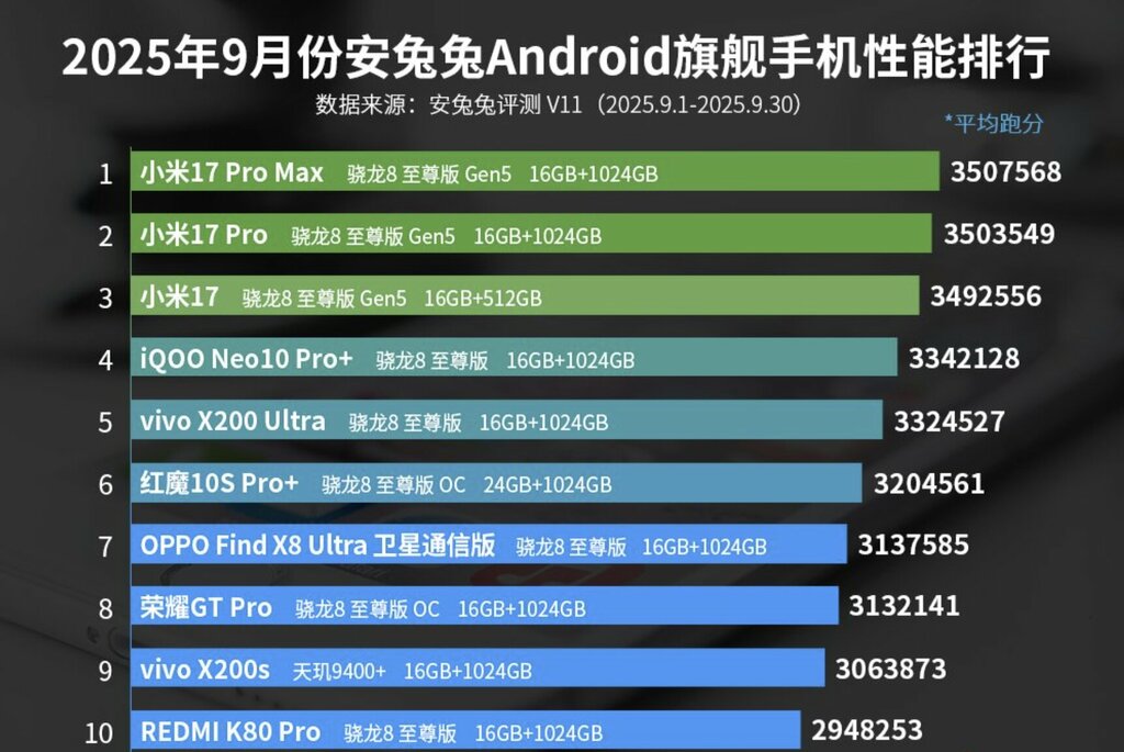 Na początek mamy Xiaomi 17 Pro Max, co akurat nie stanowi żadnego zaskoczenia. Flagowce tego producenta to jedyne modele ze Snapdragonem 8 Elite Gen 5, które już trafiły do sklepów. Widać to zresztą po całym podium – Xiaomi 17 Pro jest drugi, podczas gdy trójkę zamyka Xiaomi 17.
