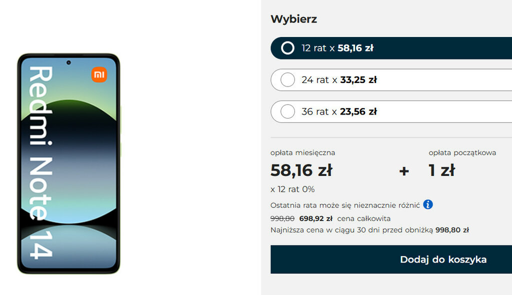 Tyle zapłacisz zamawiając Redmi na 12 rat po 58,16 zł każda. Ich suma (oraz symbolicznej opłaty startowej 1 zł) daje właśnie 698,92 zł. To obecnie najlepsza cena tego smartfona na rynku, która zwykle zaczyna się od przeszło 800 złotych.