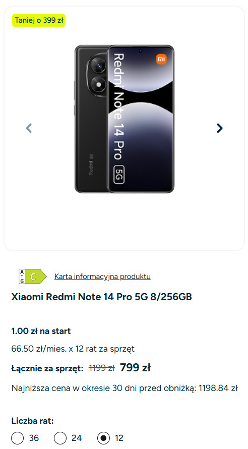 Plus oferuje model Xiaomi Redmi Note 14 Pro 5G 8/256 GB. Wybierając najtańszą opcję ratalną, a więc na 12 rat, telefon ten kosztował przed promocją 1199 zł. Dziś jest to zaledwie 799 złotych, a więc o 400 złotych mniej, choć zielony operator informuje o „rabacie 399 zł”.