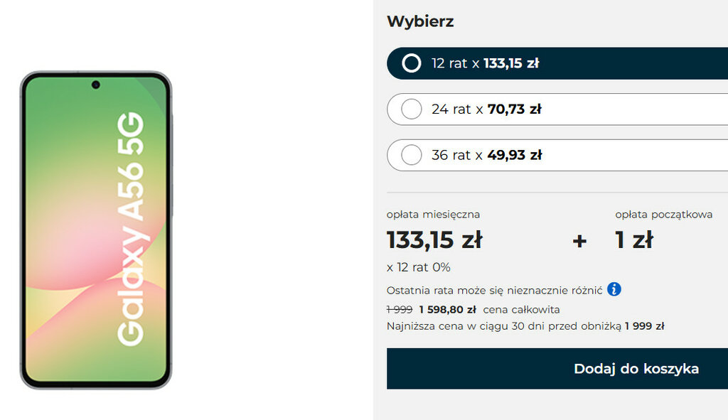 Zielony operator komórkowy Plus życzy sobie teraz za Samsunga Galaxy A56 5G nie 1999, a 1599 złotych. Taka cena jest dostępna jedynie w opcji na 12 rat; możesz też wybrać warianty na 24 i 36 rat, ale od razu uprzedzam, że smartfon wychodzi w nich drożej.