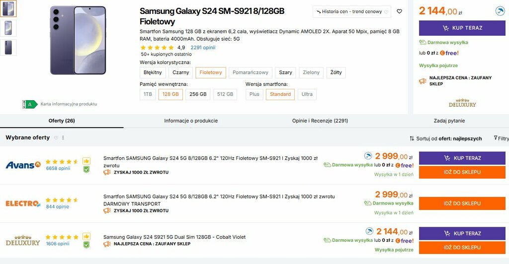 Na początek kilka słów o samej promocji. Od polskiego sprzedawcy przy wysyłce z Polski na platformie AliExpress namierzyłem Samsunga Galaxy S24 za 1965 złotych. Do obniżenia ceny do takiego poziomu posłuży kupon rabatowy, który u mnie naliczył się sam – jeżeli u Ciebie nie wchodzi, to dodaj kod PL1035, obniżający cenę o 135 złotych.