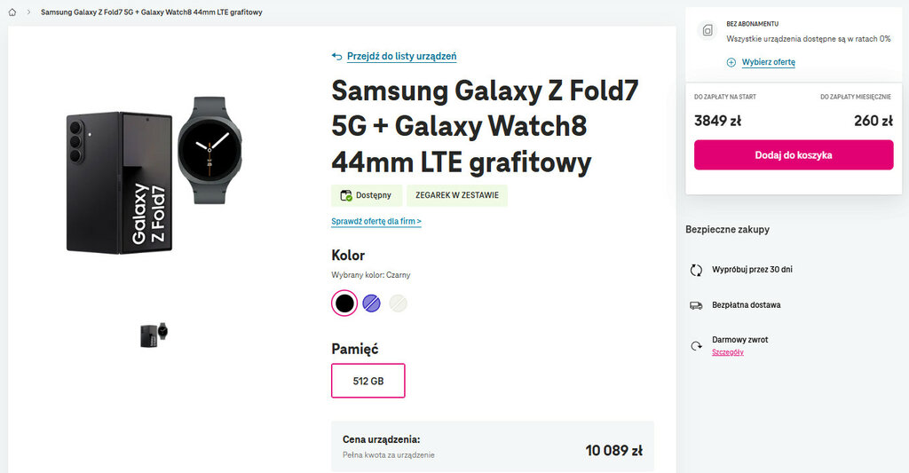 Za zestaw Samsung Galaxy Z Fold7 512 GB + Samsung Galaxy Watch8 44 mm LTE zapłacisz na t-mobile.pl 10089 złotych. Opłata startowa wynosi 3849 zł, a do tego dochodzą 24 raty 0% po 260 złotych każda. Opcjonalny abonament jest opłacany osobno, którego możesz, ale na szczęście nie musisz zamawiać.