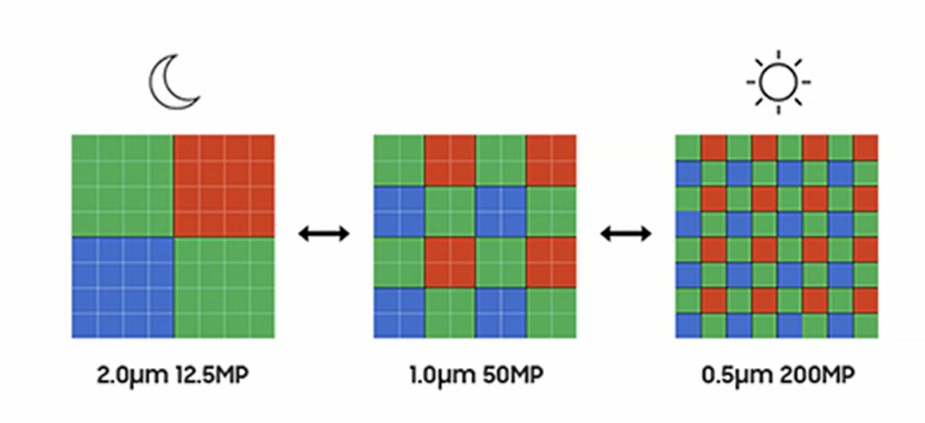 Ważną cechą jest dobieranie stopnia łączenia sąsiadujących pikseli w jeden. Przykładowo przy 12.5 MP rozmiar pojedynczego piksela wyniesie 2.0μm (słabe światło), przy 50 MP będzie to 1μm (zdjęcia w pomieszczeniach czy w pochmurny dzień. Gdy światła jest cała masa, jak w słoneczny dzień, fotki możemy cykać przy 200 MP, a pojedynczy piksel ma wtedy 0.5μm. Nie mogę się doczekać, żeby to przetestować.