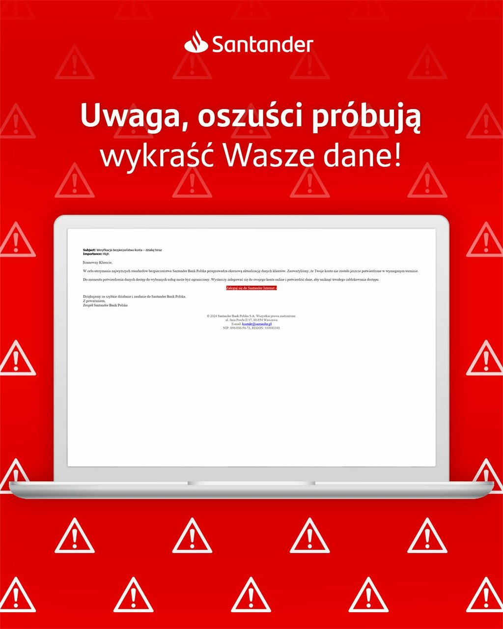 Santander ponownie publikuje wiadomość w arcyważnej sprawie. Sytuacja jest na tyle poważna, że poinformowano o niej zarówno na stronie internetowej banku, jak i mediach społecznościowych. Jeśli jesteście klientami tej instytucji, to powinniście niezwłocznie się z tym komunikatem zapoznać.