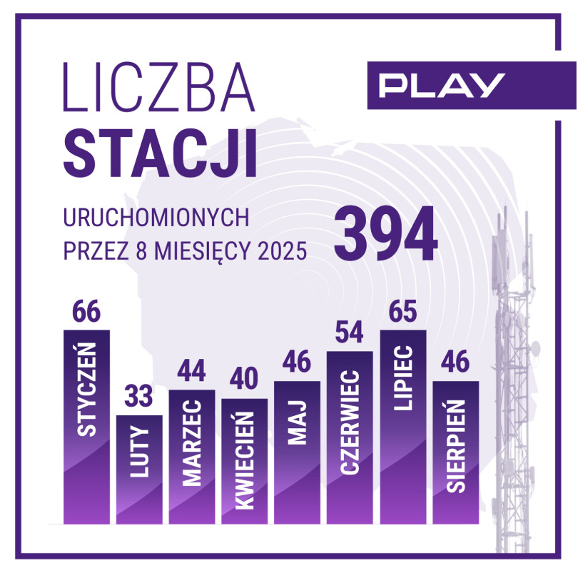 Fioletowy operator może pochwalić się jeszcze większymi liczbami. W pierwszym półroczu br. postawił 283 nowe stacje na terenie całego kraju, a ich łączna liczba zamknęła się w liczbie 12 709 masztów. Teraz jest ich – jak informował we wrześniu Play – jeszcze więcej, bo 12 820. W planach Play jest posiadanie przynajmniej 15 000 stacji, ale możliwe, że – w razie zaistnienia takiej konieczności – będzie ich jeszcze więcej.