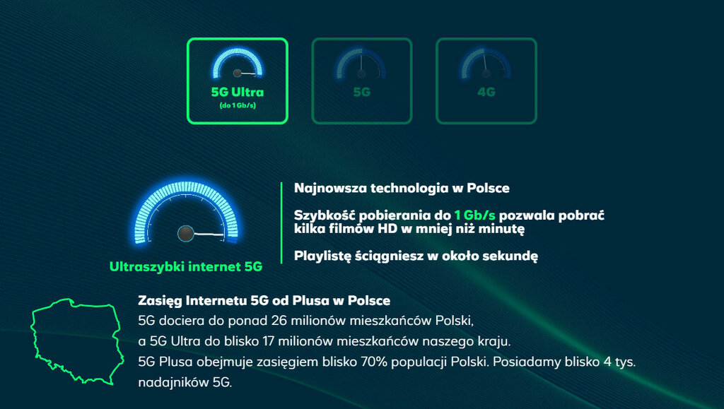 Plus to jeden z najstarszych operatorów komórkowych w Polsce, który pamięta jeszcze drugą połowę lat 90. Telekom o bardzo długiej tradycji na obecnie około 9000 stacji bazowych, z czego niemal połowa to nadajniki 5G. Plus obejmuje swoim 5G 70% populacji Polski: 5G dociera do ponad 26 mln mieszkańców kraju, a jego 5G Ultra – do blisko 17 mln.