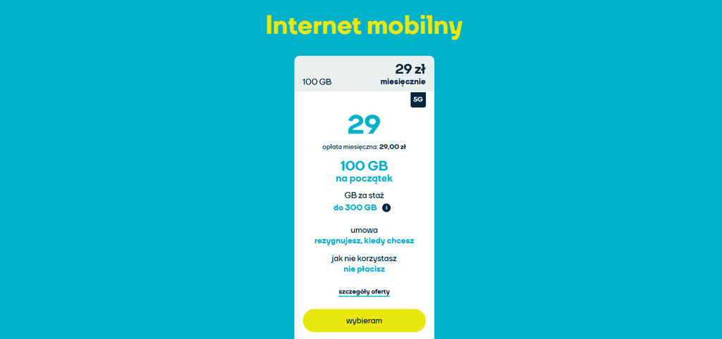 Na dobry początek jest to 100 GB 5G, a więc już samo w sobie dużo, ale to nie wszystko. Po 6 miesiącach do dyspozycji otrzymasz aż 200 GB na miesiąc, po roku – 250 gigabajtów, a po 2 latach aż 300 GB 5G za 29 zł! W przeliczeniu na złotówki, na starcie dostaniesz 3,44 GB za 1 zł, a po 24 miesiącach za każdą złotówkę otrzymasz aż 10,34 GB. Po prostu fantastycznie! Sieć nju korzysta z infrastruktury macierzystego Orange.