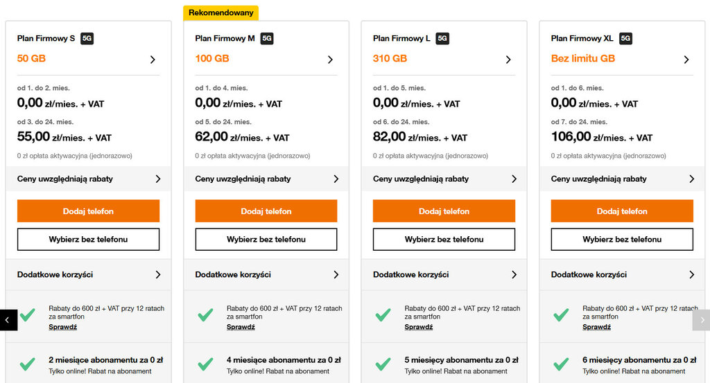 Na samym abonamencie Orange dla firm zaoszczędzisz nawet 782,28 zł brutto (636 netto). Tyle kosztuje przez 6 miesięcy topowy Plan Firmowy XL. Co więcej, możesz też liczyć na darmową opłatę aktywacyjną w każdym pakiecie, a także 2 usługi za 0 zł przez cały okres obowiązywania umowy z Orange: CyberTarcza i Extra karta eSIM. Rabaty 0d 3 do 6 miesięcy obowiązuje w umowach na 2 i 3 lata.