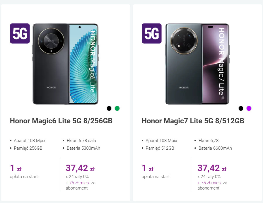 Przykładowo w Abonamencie M 5G Honor Magic7 Lite i Magic6 Lite kosztują po 899 złotych. Na tę kwotę składa się jednorazowa opłata startowa w wysokości jednej złotówki i 24 raty 0% po 37,42 zł. Możesz oczywiście zdecydować się na sam telefon bez abonamentu, w którym Honor Magic6 Lite kosztuje cały czas 899 zł, ale jego następca jest już droższy, a cena wynosi 1099 złotych.