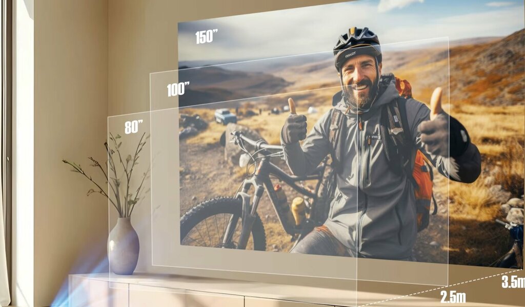 Poza tym nie musisz mieć wielkiego salonu, by wyświetlić obraz o potężnej przekątnej. Wystarczą 2 metry, by cieszyć się filmem czy serialem na 80 calach. 2.5 metra to już 100 cali. Ponadto Magcubic maksymalnie oferuje 150 cali przy 3.5m. Nawet w małym mieszkaniu w bloku da się to wygospodarować.