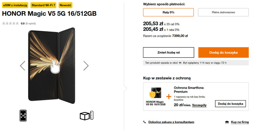 Kwota 7399 złotych jest najniższą obecnie ceną Honora Magic V5, ale nie tylko Orange oferuje raty 0%. Dostaniesz je także choćby w RTV Euro AGD (w sumie również 7399 zł), różnica polega na tym, że można wybrać maksymalnie do 30 rat. Przekłada się to na ratę miesięczną w wysokości 246,63 zł, a więc o niemal 20% wyższą. Owszem, spłacisz telefon pół roku wcześniej w tej samej cenie, ale kosztem wyższego obciążenia miesięcznego.