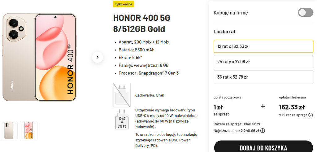 Na raty z pewnością, ale ten sam model 8/512 GB może być Twój już za 1849 złotych. Problem w tym, że Honor 400 dość rzadko występuje w tej konfiguracji pamięci wewnętrznej. Znacznie większy wybór znajdziesz z opcją 8/256 GB, której ceny zaczynają się już od ~1535 złotych. Kto wie, może to być to dla Ciebie najlepsza propozycja, o ile oczywiście zdecydujesz się na płatność jednorazową (mniejsze sklepy zwykle nie oferują rat).