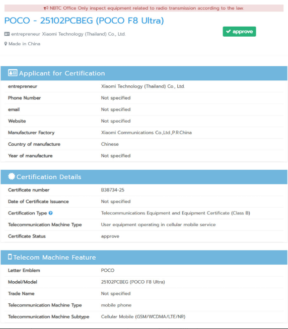 Zgodnie z informacjami z NBTC, Xiaomi szykuje globalną wersję POCO F8 Ultra oznaczoną numerem 25102PCBEG. W tym kontekście G znaczy Global. To potwierdza wcześniejsze przecieki, według których smartfon będzie międzynarodowym odpowiednikiem wspomnianego powyżej Redmi.