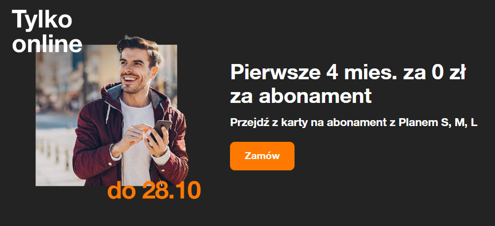 Przez pierwsze 4 miesiące nie będziesz nic płacił za abonament, który kosztuje odpowiednio 65, 75 i 95 zł miesięcznie. Promocja abonamentu Orange trwa online tylko do 28 października.