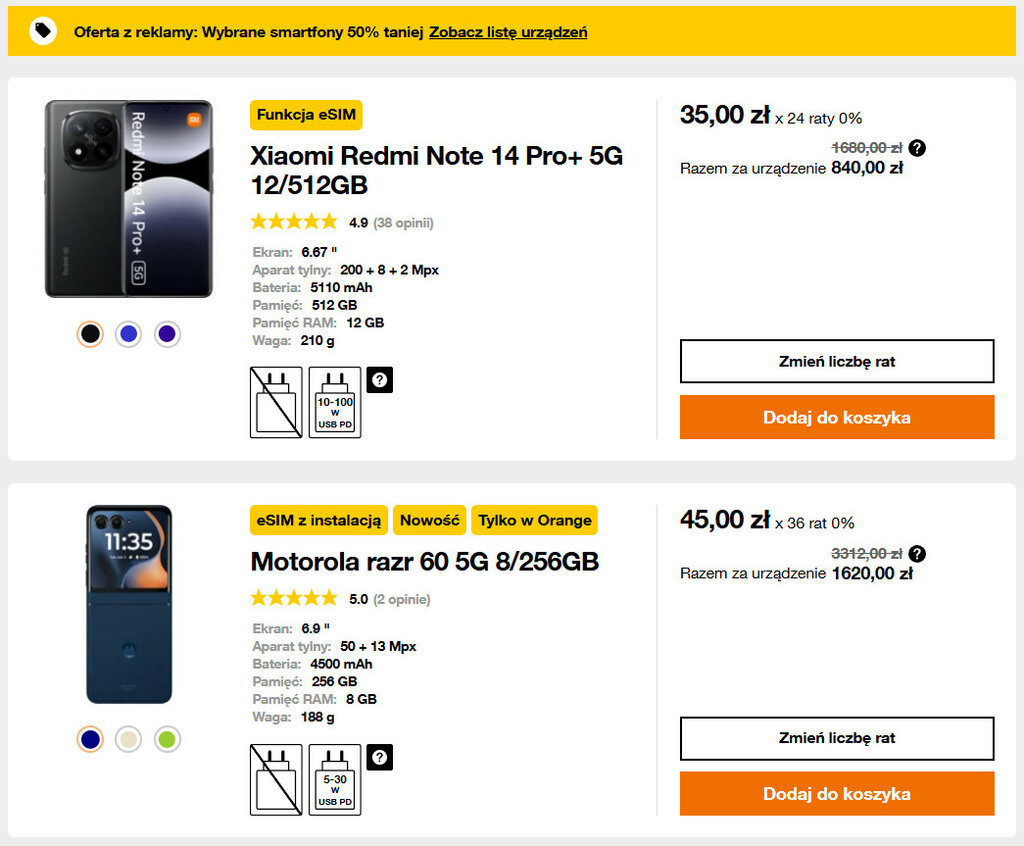 Co innego przecenione o ~połowę smartfony na orange.pl. Tu wyprzedaż trwa (prawdopodobnie) do wyczerpania zapasów i nie tylko Motorola Razr 60 jest objęta takim rabatem.