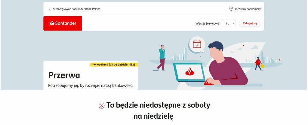 Przerwa w Santander Bank rozpocznie się 25 października o godzinie 23:00 w sobotę i zakończy się 26 października o godzinie 6:00 w niedzielę. Jak zdradza sam bank, potrzebuje on chwili, aby rozwinąć działanie obecnych funkcji.