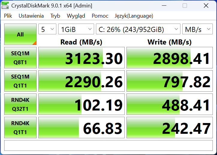 Sprawdziłem również, jak radzi sobie dysk zastosowany w tym laptopie. GOFATOO w benchmarku nie wygląda źle, jednak w praktyce daleko mu do nawet tanich rozwiązań z „naszego” rynku.