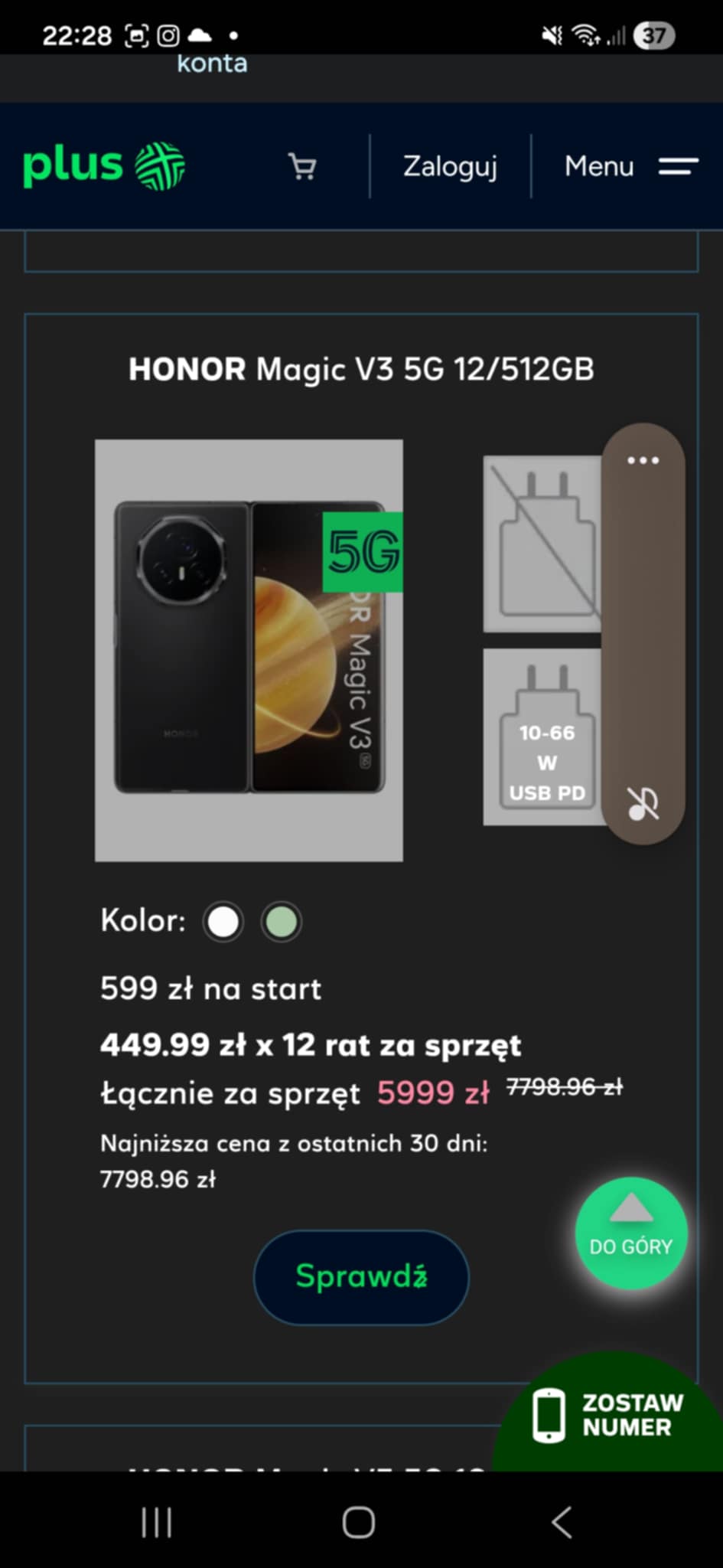 Tyle zapłacisz za niego, decydując się na ofertę bez umowy na 12 rat po 449,99 zł miesięcznie (jednorazowa opłata na start to 599 złotych). Honor Magic V3 dostępny jest w kolorze czarnym i zielonym, a także w opcji na 24 i 36 rat, ale wówczas jego cena jest wyższa i przekracza próg 6000 zł. A czy promocja Plusa oznacza, że mamy do czynienia z najlepszą ceną tego Honora?