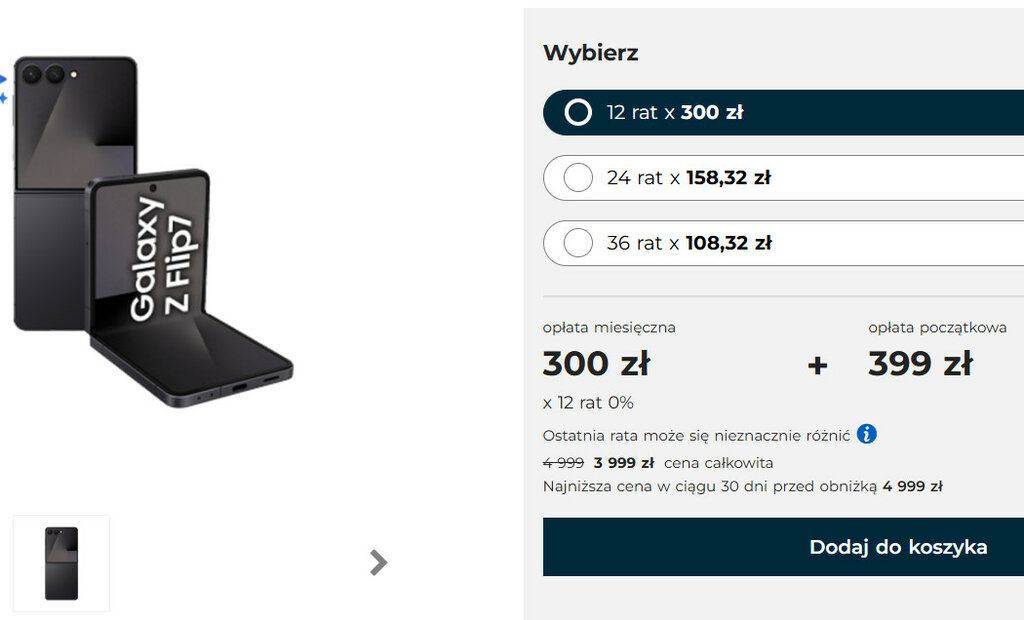 Mimo tak ogromnych, bo sięgających 20% rabatów, oferta Plusa nie jest najniższa na rynku. Samsung Galaxy Z Flip7 z pamięcią 12/256 GB może być Twój już za ok. 3312 złotych, również bez abonamentu, choć niekoniecznie na raty. Jeżeli jednak szczególnie Ci na nich zależy i bez nich nie ma mowy o nowym smartfonie, to faktycznie Plus może okazać się bardzo pomocny.