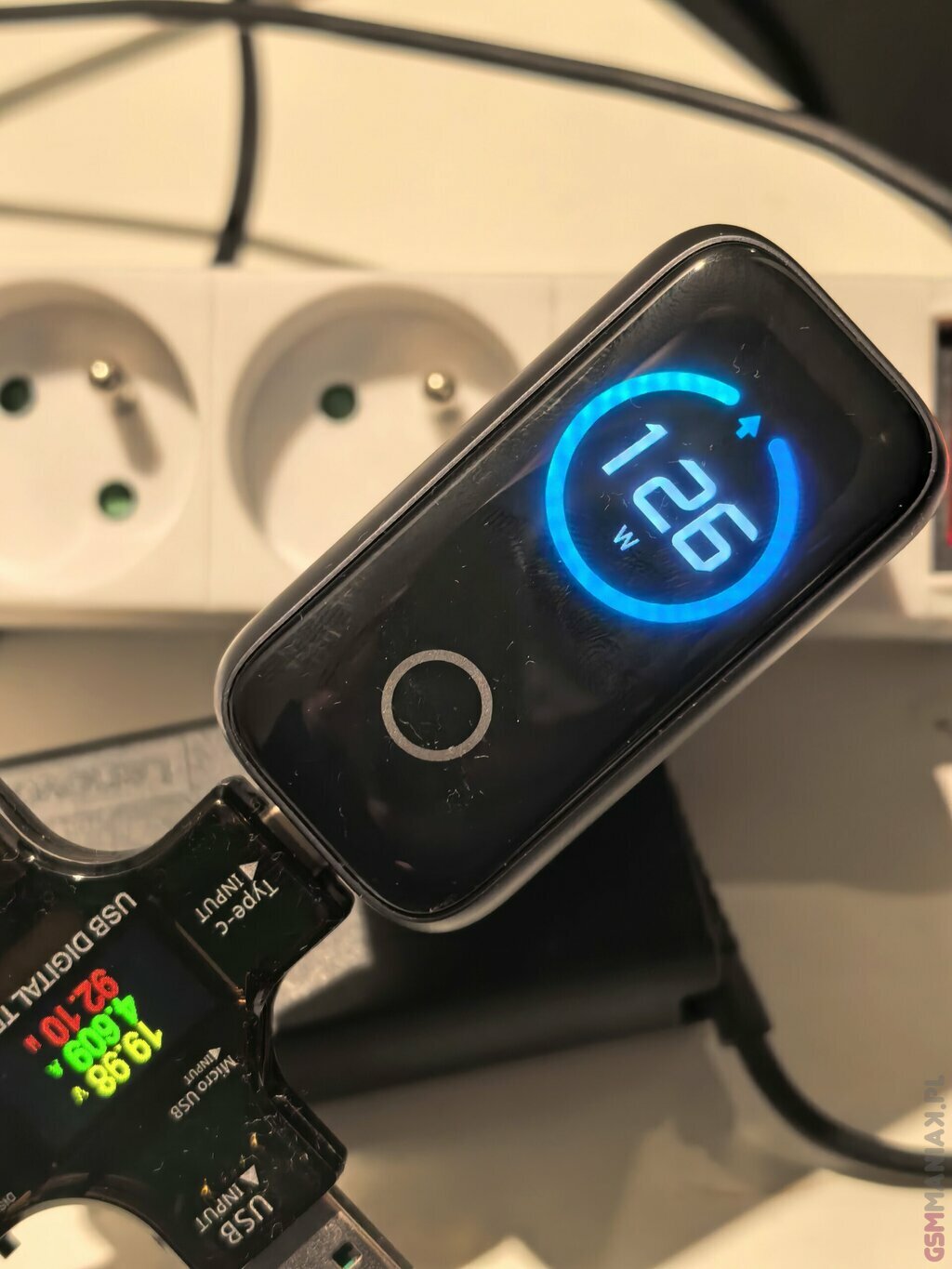 Mimo prób nie udało mi się uzyskać maksymalnych 140 W łącznej mocy, choć wynik 126 W jest już bardzo blisko tego pułapu. Przy takiej konfiguracji (laptop, tablet i smartfon) ładowarka rozdzielała energię mniej więcej na poziomie 65 W, 31 W i 30 W.
