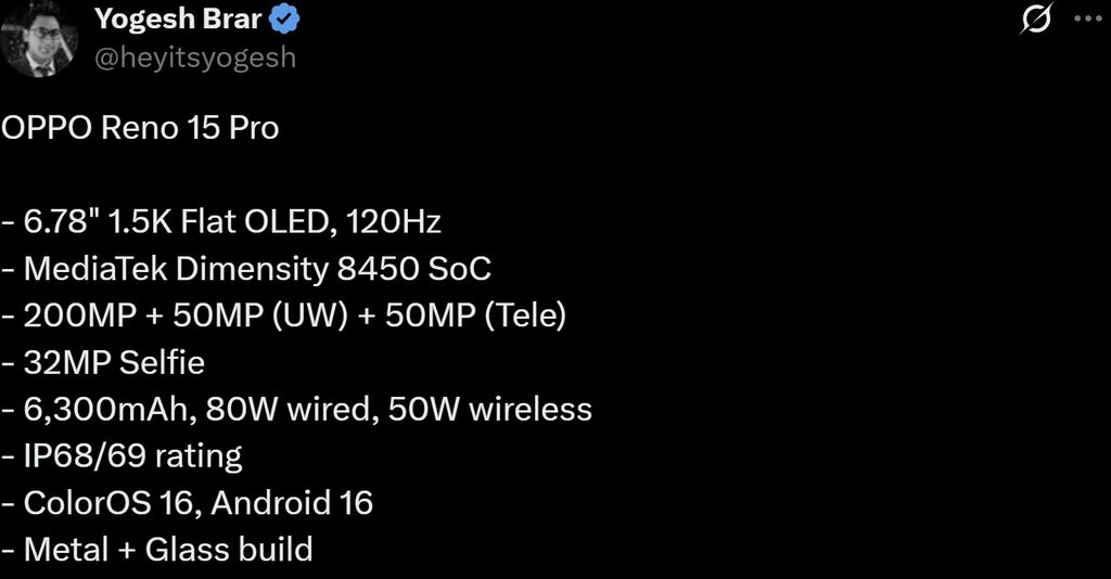 Oppo Reno 15 Pro będzie smartfonem, którego koronnym argumentem za zakupem będą możliwości fotograficzne. W tym przypadku możemy liczyć na 200 MP aparat główny z OIS, 50 MP szeroki kąt oraz 50 MP teleobiektyw (zakładam, że z OIS, ale potwierdzenie jeszcze nie mam).