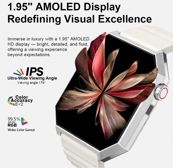 Urządzenie wyposażono w 1,95-calowy ekran AMOLED o rozdzielczości 460×460 pikseli, z pokryciem 99,5% palety Adobe RGB. Moim zdaniem ten podzespół wybija się przed szereg. Nie tylko w samej specyfikacji, ale także w porównaniu do innych modeli za około 100 złotych.