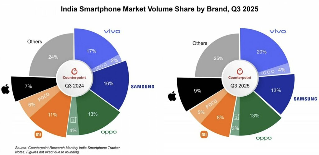 Counterpoint Research opublikowało wyniki sprzedaży smartfonów w Indiach. Co one obchodzą nas, w Polsce? Otóż obchodzą nas tyle, że fajnie prezentują, co kupowalibyśmy przy niższych cenach i maksymalnie szerokiej ofercie. I kolejny rok z rzędu wychodzi na to, że kupowalibyśmy vivo. Nawet bez iQOO kontrolują 20% tego olbrzymiego rynku. Razem z iQOO to już 24%. Pogrom to mało powiedzane.