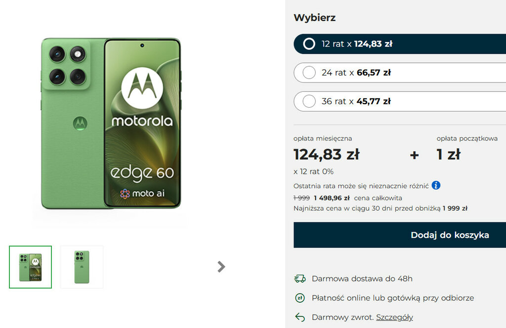 Zacznijmy od tego, że Plus oferuje swoje telefony – i inne sprzęty – na 12, 24 lub 36 rat. Nie są one jednakowe, tj. opcja ratalna z 12 ratami wychodzi najtaniej. Motorola Edge 60 została w niej pierwotnie wyceniona na 1999 zł, a ile kosztuje po rabacie -25%?