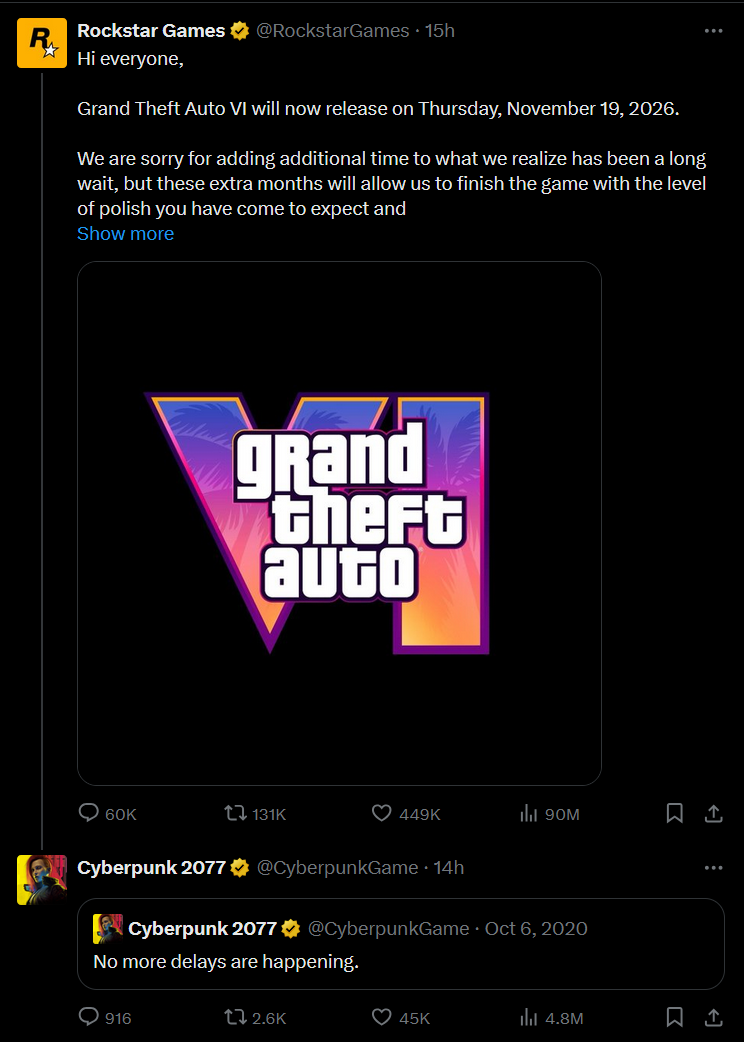Stało się to, czego teoretycznie można było się spodziewać. Premiera GTA 6 przesunięta o kolejne pół roku, a łącznie, to w zasadzie już o rok. Rockstar najwidoczniej nie poradził sobie z dowiezieniem na czas wszystkiego, co zaplanował. Nie jest jednak odosobniony, a w zasadzie bardzo późno dołączył do „standardów branżowych”, gdzie przesuwanie premiery o kolejne miesiące ma się dobrze od paru lat.