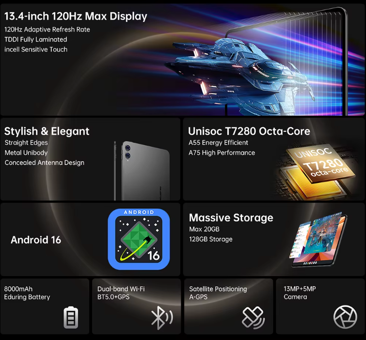 Front wypełnia 13.4-calowy LCD IPS z rozdzielczością 1920×1200 pikseli i odświeżaniem 120 Hz. Nie do końca jednak jestem pewien zaimplementowanego systemu. Niby na grafikach widać opis Androida 16, ale sklep posłużył się nazwą Android 15. Ta kwestia pozostaje nierozstrzygnięta. Tak czy siak, całość prezentuje się solidnie, zwłaszcza w niewygórowanej cenie poniżej 500 złotych.