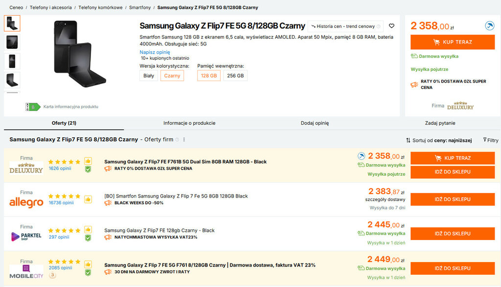 Pierwotnie, tj. 9 lipca 2025 roku Samsung Galaxy Z Flip7 FE 8/128 GB został wyceniony w Polsce na 4299 zł. Od tego czasu minęły ledwie 4 miesiące, a może być Twój już 2358 złotych. To o 45% mniej niż cena premierowa sprzed 120 dni! To szczególna okazja, bo wreszcie składany Samsung może być Twój w uczciwej cenie.