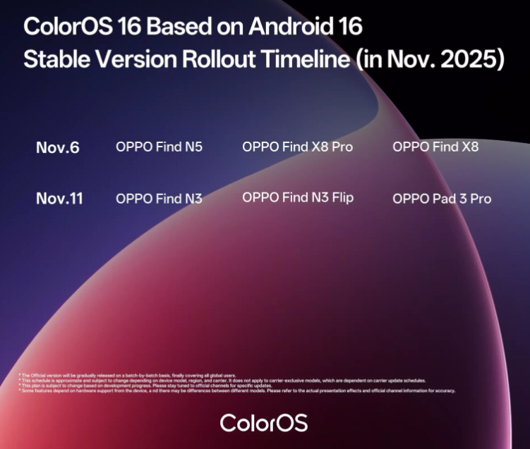 Świeże oprogramowanie bazujące na Androidzie 16 zaczyna docierać do OPPO Find N5, OPPO Find X8, OPPO Find X8 Pro, OPPO Find N3, OPPO Find N3 Flip oraz OPPO Pad 3 Pro, zgodnie z powyższym harmonogramem wdrożeniowym.