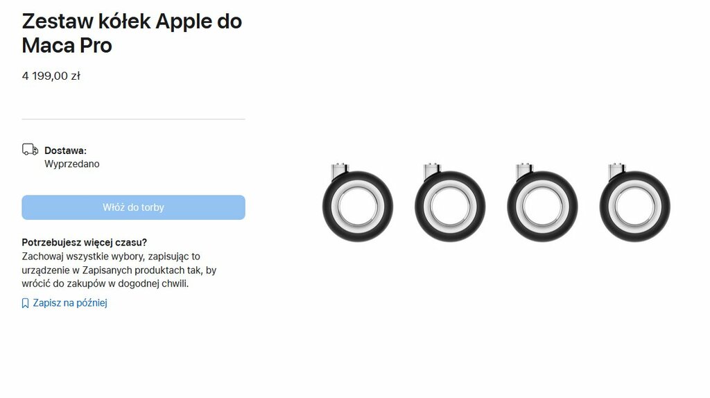 Ostatnie z akcesoriów, które chcę wspomnieć, nie ma jednak sobie równych. Pamiętacie Maca Pro, który wyglądał jak tarka do sera? No to mogliście sobie do tej tarki do sera dokupić kółka, w przyziemnej ofercie, za 4199 złotych. By Wam zobrazować tę kwotę — za tyle można kupić Maca Air, laptopa od Apple, a nie kółeczka…