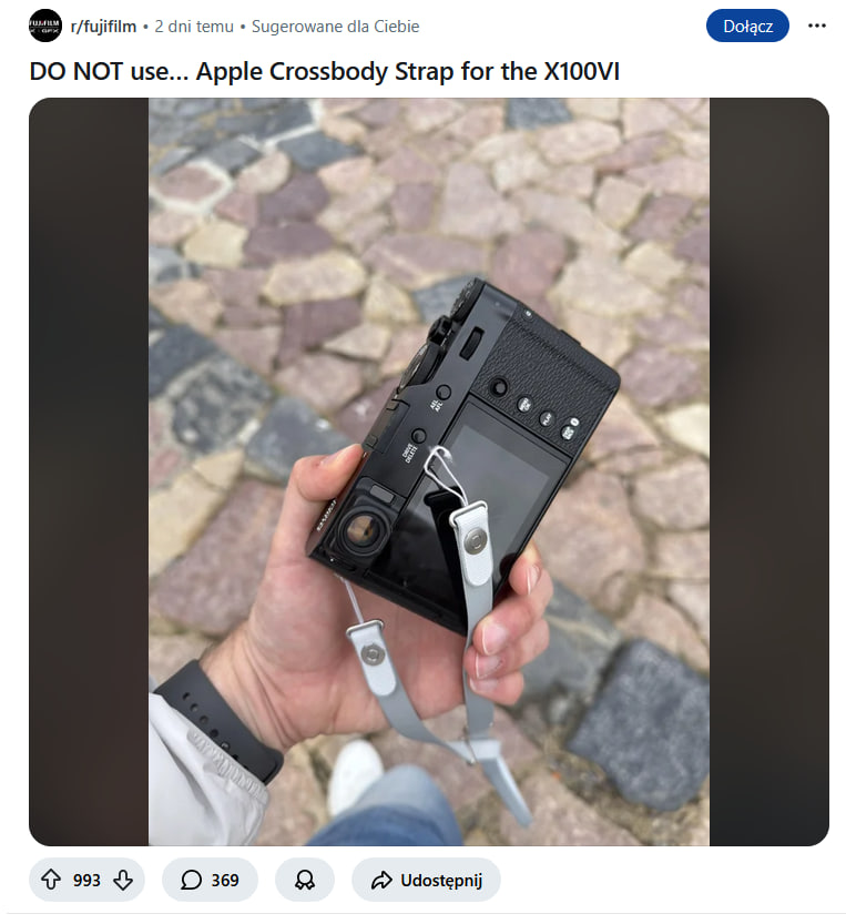 Na zakończenie jednak przygotowałem dla Was pokazanie, ile takie akcesoria są warte. Wyobraźcie sobie wydać ponad 3 stówy na pasek, bo Wam się podoba, bo ufacie, że jest dobrze wykonany i stwierdzacie, że użyjecie go przy małym, bezlusterkowym aparacie. Jak widać, ten użytkownik Fuji miał szczęście, bo urwała się tylko jedna strona — tyle z jakości takich akcesoriów.