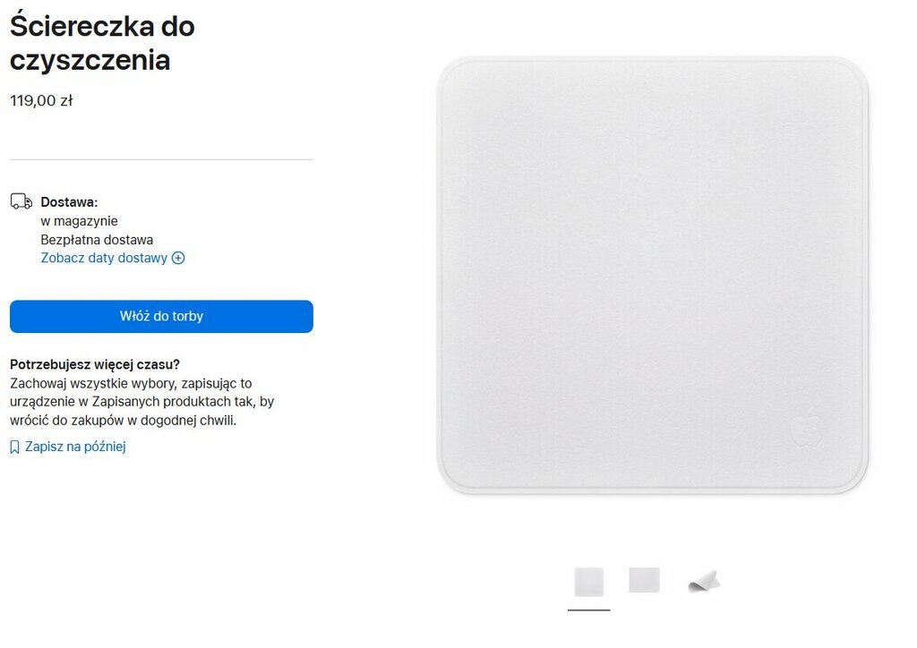 Przypomnijmy zatem takie akcesoria, które zdobyły „sławę”, ale niekoniecznie taką, jaką Apple chciałoby. Przed Wami szmatka, ściereczka do czyszczenia, którą Amerykanie wypuścili jako „dedykowaną do swoich ekranów”. Teoretycznie 119 złotych nie robi większego wrażenia, ale no… to tylko ścierka z mikrofibry, nic więcej. W takiej cenie spokojnie 5 „dobrych jakościowo” byście kupili, bez „znaczku”.