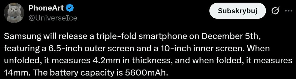 IceUniverse, który z reguły dysponuje dobrej jakości materiałami na temat koreańskich smartfonów, podał datę premiery podwójnie składanego modelu. TriFold, czy jakkolwiek miałby się nazywać zadebiutuje w ciągu miesiąca – dokładnie 5 grudnia.