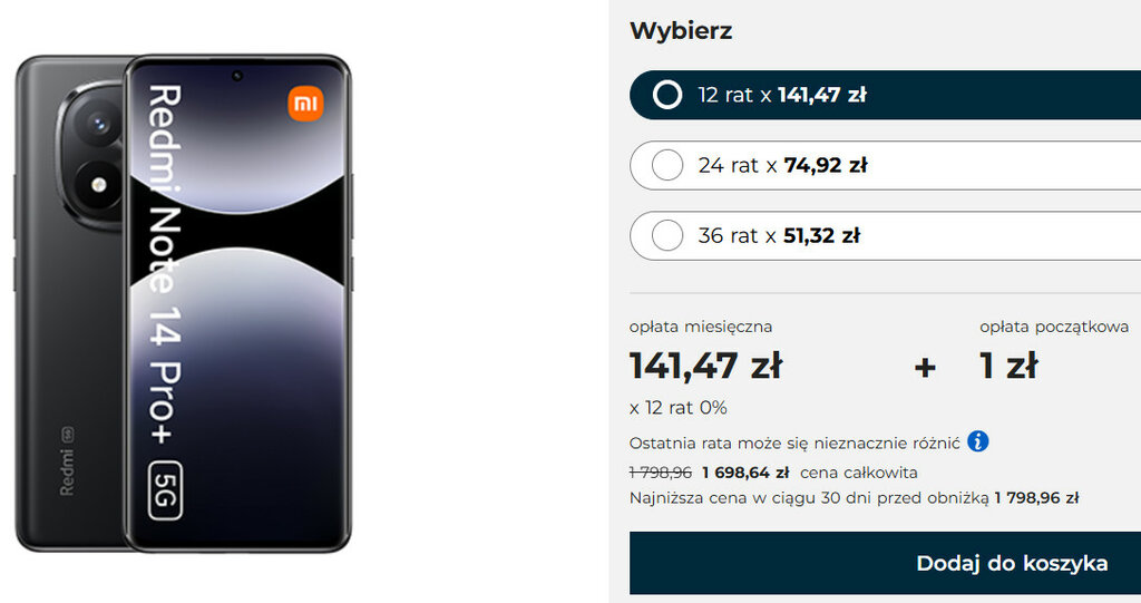 Co prawda zielony operator komórkowy operuje sformułowaniem „raty 0%”, to jednak w tym przypadku nie są one tak do końca nieoprocentowane. Owszem, jeśli zdecydujesz się na opcję z 12 ratami, zapłacisz za Xiaomi Redmi Note 14 Pro+ najmniej ze wszystkich propozycji Plusa. Z kolei warianty na 24 i 36 rat wychodzą drożej, choć czasami zdarzają się wyjątki z 36 ratami 0%. Skupmy się tym razem na najtańszym rozwiązaniu, a więc 12 ratach.
