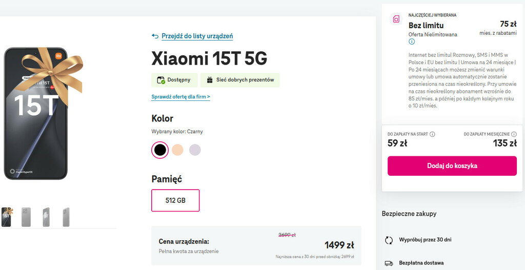 Wracając do Xiaomi 15T 512 GB, jest on spłacany w 24 ratach 0% po 60 zł. Jednorazowa opłata na start wynosi z kolei 59 zł. Jeżeli chciałbyś tego flagowca z aparatami Leica również w niskiej cenie, ale niekoniecznie w abonamencie, to możesz wyrwać wersję 256 GB za niecałe 1900 złotych. Dodam tylko, że 1,5 miesiąca temu model 512 GB kosztował 2999 zł.