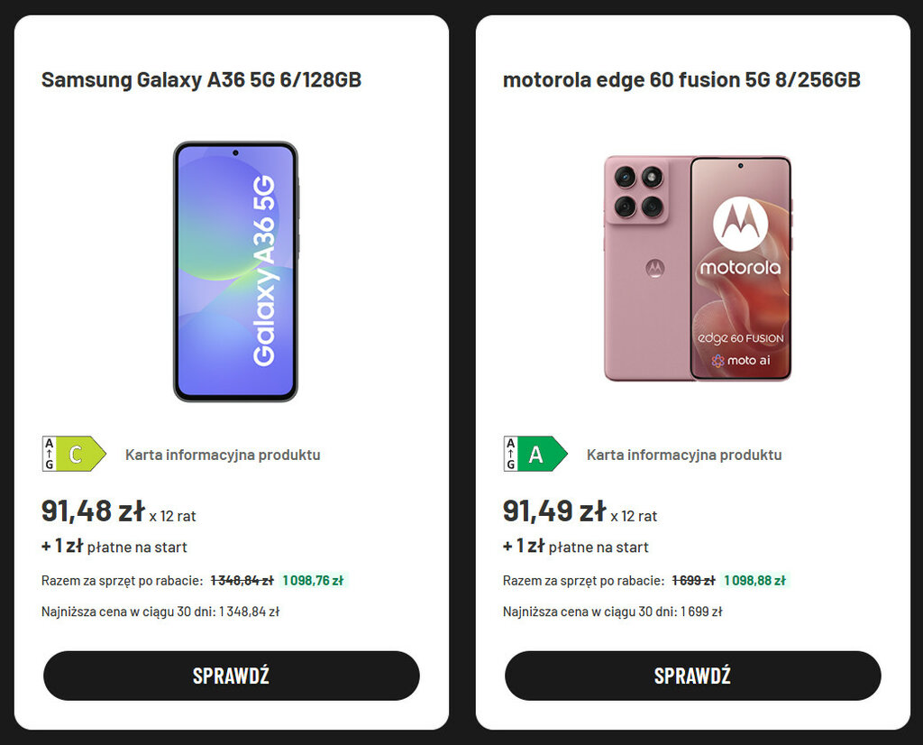 Do wyboru masz opcje na 12, 24 lub 36 rat. Najkorzystniej finansowo wypada oferta z 12 ratami, w której Motorola Edge 60 Fusion w wersji 8/256 GB kosztuje tylko nieco ponad 1000 złotych.